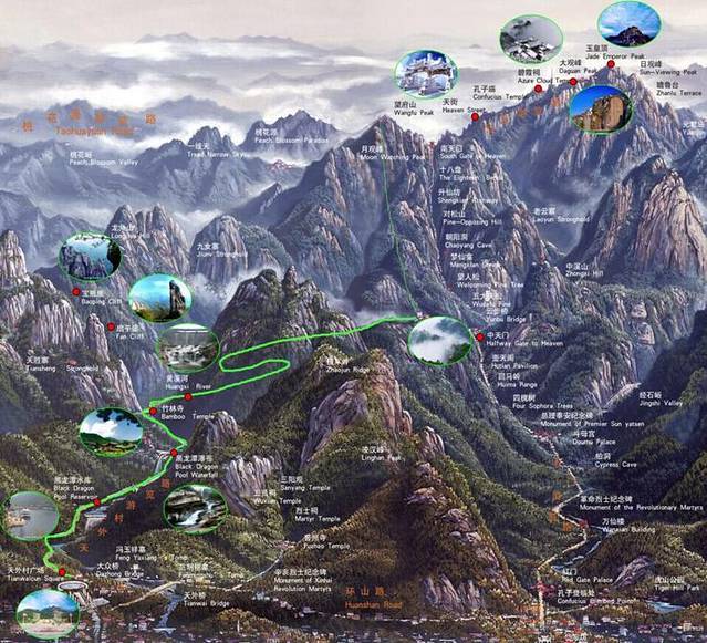 西路游览线是最便捷、最省时、最省力的登顶路线,适合体力差者或时间不充裕者。如选择此路线上山,艰辛的跋涉攀登过程不复存在,登顶也由一段汗流浃背的历程演变成节奏轻快、休闲舒适的交通工具大换乘。