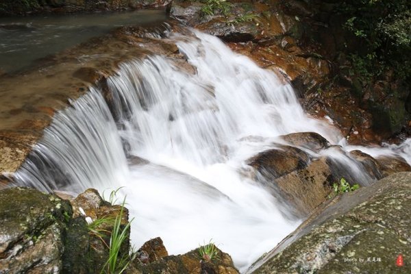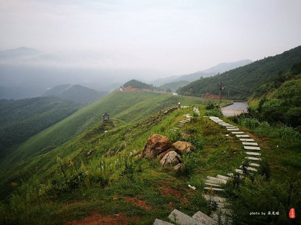 我们决定选择另一条路下山,没想到还柳暗花明又一村,发现梅岭背后的美丽,更加安静,更加原生态。有茶园,村庄,水库,盘山公路,夏日里满眼的翠绿,天空也因为刚才的雨刷洗了一遍而更加清澈,空气中弥漫着几缕青烟,有青石板铺就的步道蜿蜒而下。