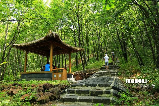 沿着由火山岩石堆砌的石阶一路向上,周围绿树环绕,古木葱茏,虽然山势舒缓,但一路往山上爬仍然汗流浃背,路边偶有新修建的茅草亭或石凳可以休憩。