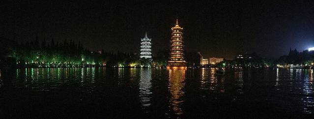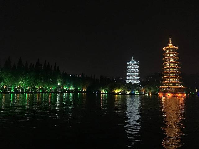 从象鼻山出来我们就走去日月双塔了,日月双塔竟然也有门票要买!这个我们觉得完全没必要咯,在外面的小路上围着走一圈都已经很好的看到了,都不知道为什么要门票进去,这里也有船可以坐的,我们还是觉得没必要,大家如果有闲钱就坐吧...日月双塔我们是打算看夜景的,晚上比白天好看多了,所以就直接走去步行街打算吃个饭再来,然后呢,对于我们广东妹子来说,这步行街实在是没啥好逛的。。。吃了个田螺姑娘(味道实在一般)找了个咖啡店坐下休息,看天黑了就走回去日月双塔了...