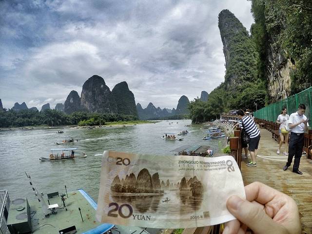 在杨堤码头坐竹筏有好几段的,我们在淘宝上订的时候旅行社告知我们由于西坪筏工罢工所以只能买到去九马画山的票(一百四十几的价格吧好像),我们去的当天导游说可以买到西坪了我们就又补了票(80还是85块)去到西坪,其实从九马画山到西坪挺近的,感觉很快就到了,但是能在江上多游一会儿,这八十几块还是很值得的,而且二十块人民币背后的风景也是在九马画山到西坪这一段上,要看这风景的必须买到西坪啊。