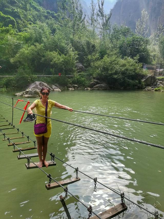 长70多米的木板铁索吊桥 ,小心翼翼地登上铁索桥,桥身无风而动,不敢快走,只能轻抬腿,迈小步,战战兢兢,缓缓而行。