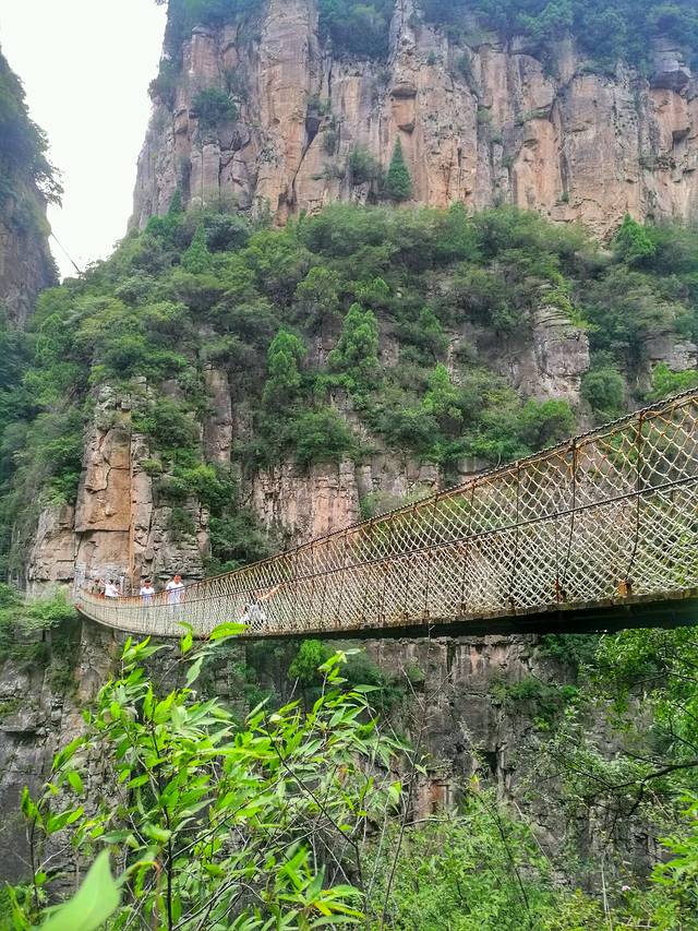 抬头仰望,一座铁索桥凌空飞架于峡谷两岸的悬崖绝壁之间,高50多米,跨度70余米。