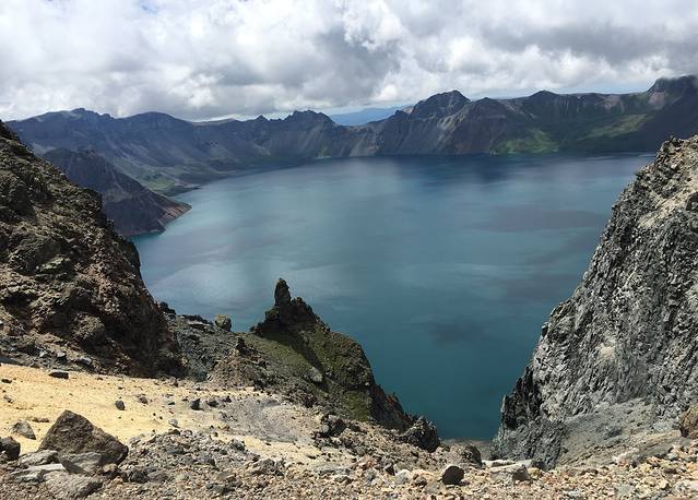 这个角度看天池不是很大,天池有三分之一在中国,三分之二在朝鲜, 天池里只有一种鱼,是朝鲜放的,虹鳟鱼,水面很平静,偶尔会泛起波纹,我想那是风吹的,应该不是水怪吧!
