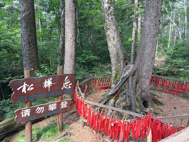 一颗松树,一颗桦树相互缠绕,昨天晚上在原始森林也看到这种,桦树为了让松树茁壮成长,替松树遮风挡雨,等到松树长大了,桦树也去世了,因为桦树寿命不如松树场。