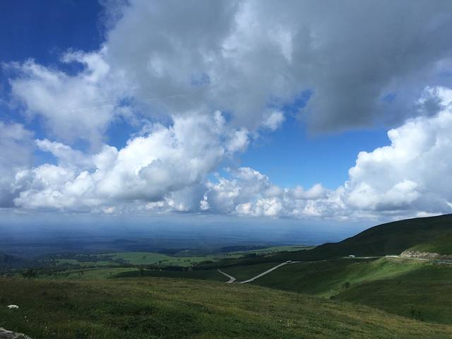 坐车去天池,这段路挺长的,直接开到半山腰,然后走台阶到天池,在导站车上拍的天空,你能想象有多美么!