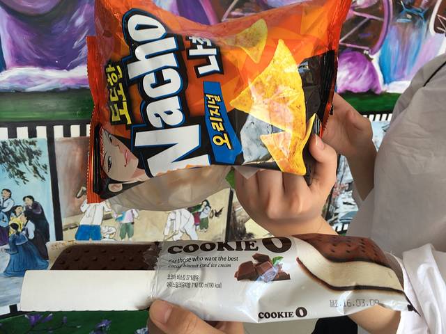 导游推荐的卖韩国用品的,薯片13,奶酪味,好吃,冰淇凌,韩国的冰淇凌大概1300韩币,比例1:160,卖10人民币,也差不多,可以尝一下,超好吃