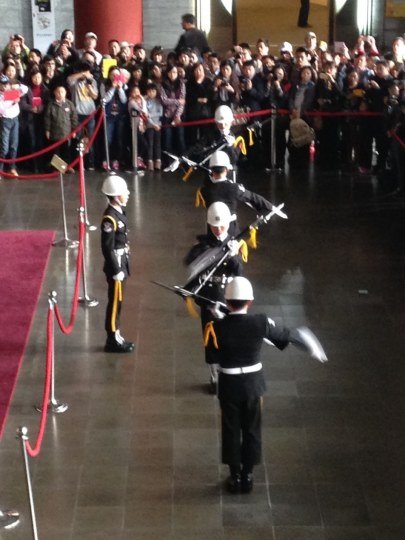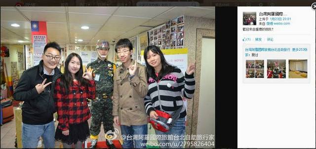 然后机场有大巴到市区,我们住在台北车站附近的,就直接坐大巴到台北车站。我们住那里叫做阿罗国际旅馆,房价,呃,太久了真心记不清楚了,反正我们在台湾平均每晚是150人民币/人吧。这个旅馆很有爱,有真人站岗的,还包早餐。他们会给来的顾客拍照,然后把顾客的照片放到微博上去,我就直接截图了。