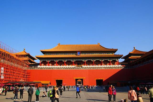穿过端门,步入端门广场,来到午门前,才算到了紫禁城的门口。午门是紫禁城等级最高、体积最大的城门。推出午门可不是斩首,而是执行廷杖打屁股。打屁股也是能打死人,也确实打死过人的。估计就这么有的推出午门斩首的说法。
