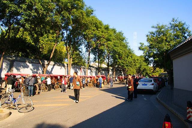 还没到正地儿呢,瞅见没,一色儿的“洋的哥”,一溜儿的洋伙计。还没走近呢,就有哥们儿上来揽活计了。见过火车站门口拉客拼车的吧,招人烦。可他们还真是不太一样,一准儿的正儿八经、官方培训、持证经营、京腔京韵,腿不停车不停,车停嘴也不停,以至于我现在不得不暂停的拉洋车的爷们儿们。还真没别的意思,就是觉得挺有意思,敢情够贫才够味儿。