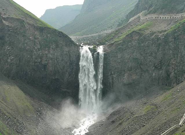 天池下来乘车来到长白山瀑布。穿过林海长廊,拐过"托云松"的弯道,有一块硕大的青石.站在这块石头上,就可以看到长白瀑布了,因此人们叫它"望瀑石"。当远处银河倒挂的瀑布映入人们眼帘的时候,一颗悬着的心似乎落了地,饱览之余,不禁使人想起唐代诗人李白"日照香炉生紫烟,遥看瀑布挂前川.飞流直下三千尺,疑是银河落九天."的著名诗句.这壮丽的图景,磅礴的气势,仿佛落在"遥看"二字上.遥看瀑布,不禁使人心旷神怡,心潮澎湃,巴不得马上站在它的面前。