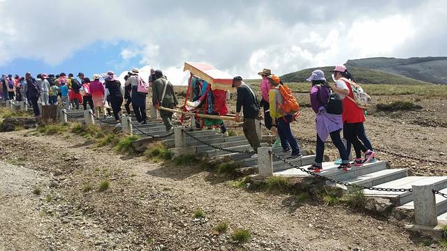 我们乘着景区巴士沿着蜿蜒盘旋的盘山公路,徐徐而上,穿梭在云间。离白云越来越近,仿佛伸手就能抓到它们。