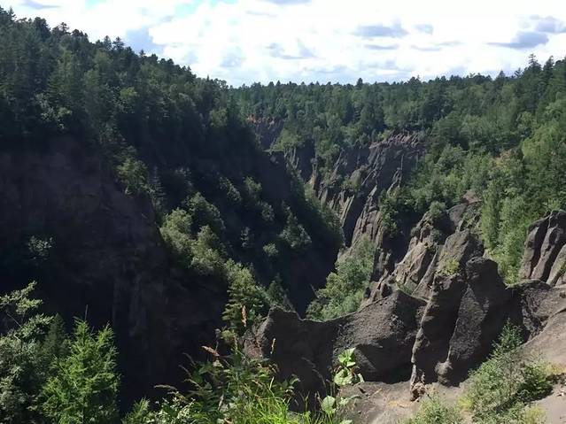 大峡谷两岸森林茂密,树干笔直而巨大,从远处望去如同排列整齐的士兵。