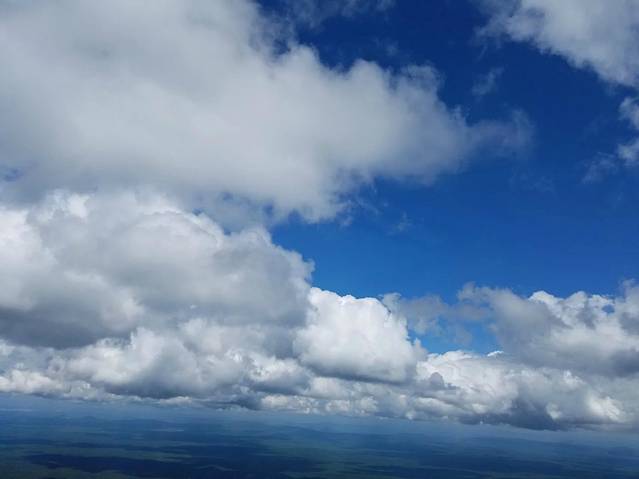 天晴得像一张蓝纸,朵朵的白云,像被阳光晒化了似的,随风缓缓浮游着。
