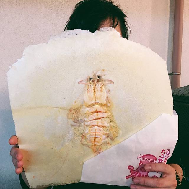 比脸大系列,一整只虾放在里面,不过好像最有名的是她家另外一种放鱿鱼的,我买错了……不过也挺好吃的,虾味很足,脆脆的。