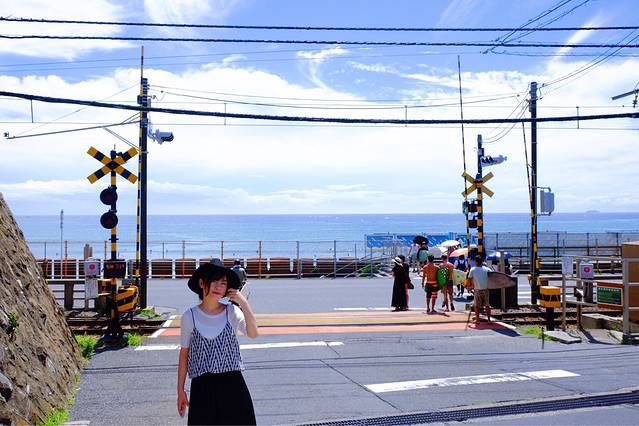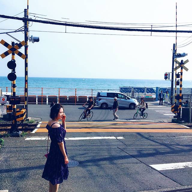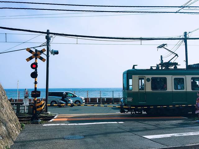 接下来还是江之电,到镰仓高校前下,出站口后向前走一分钟左右就能看见一堆人有序的围在一个铁路交叉口,没错就是这里了!