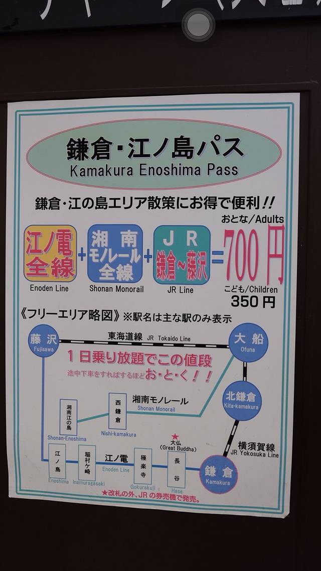 可在新宿坐小田急线直达江之岛,但是也可在涉谷坐东急东横线,然后在横滨转横须贺线在镰仓站下,因为在镰仓站有一个700円(日元)的一日周游卷,可乘坐镰仓到江之岛的各种巴士和电车,非常合适!但是在江之岛站不知道能否买到周游卷。所以推荐镰仓站下!