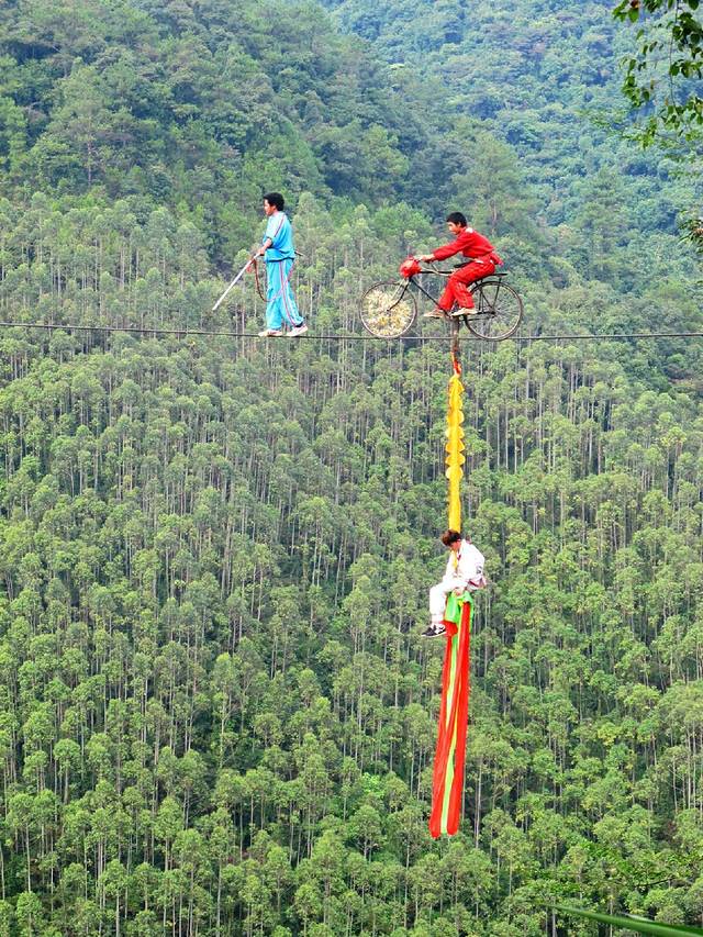 在大瀑布下面就有一个表演供游客观赏,就是空中飞人表演了!艺人们在绳索上表演各种各样的高难度动作,看的我都替他们冒冷汗了!还有骑单车,电动车过绳索的呢。不过表演时间是有规定的,要在规定的时间里才会有表演的。