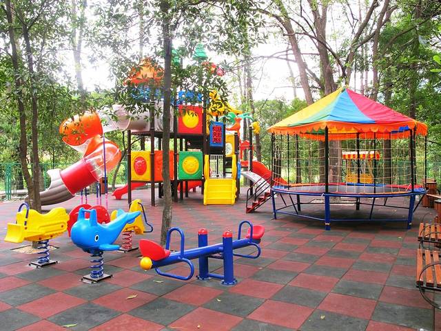 游乐场里面有挺多游乐设施的,有滑滑梯,跷跷板,跳跳床........小孩子们玩的很开心