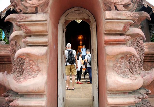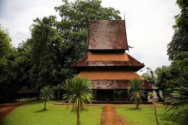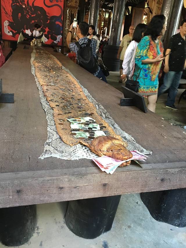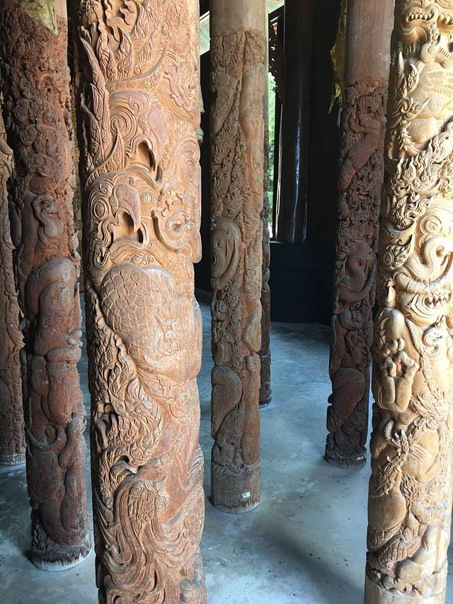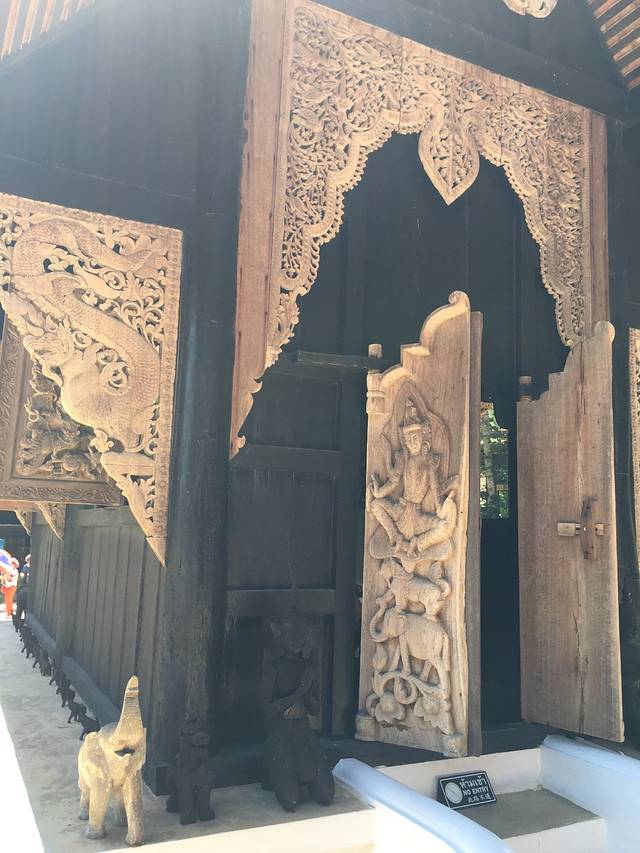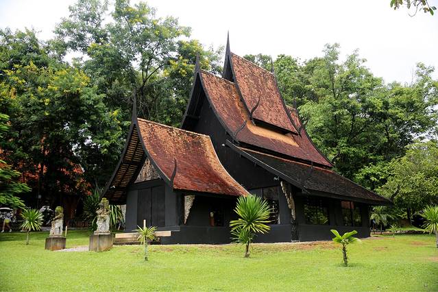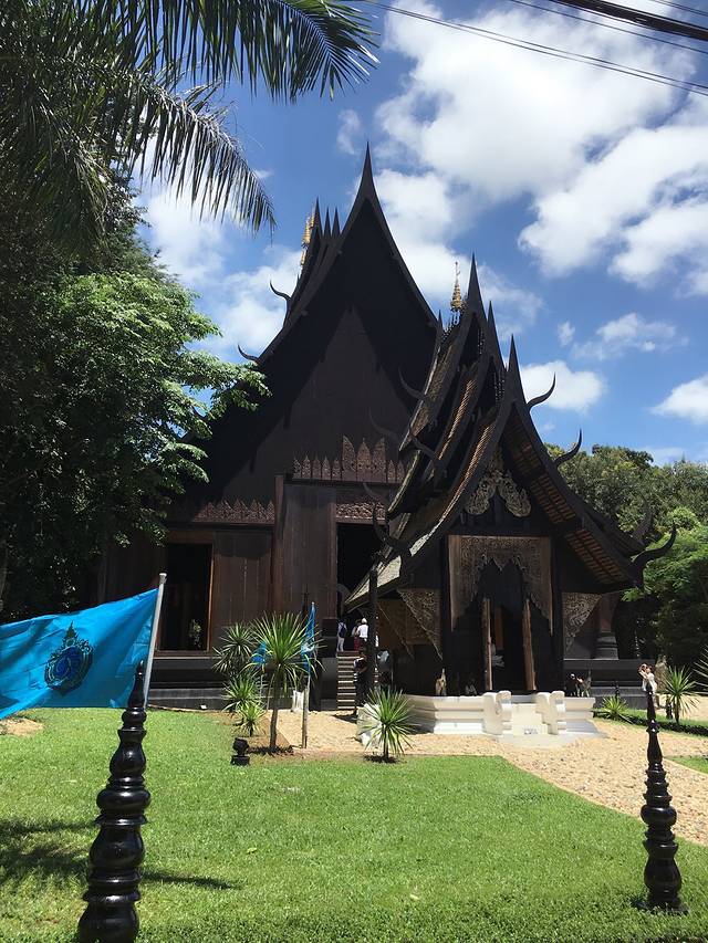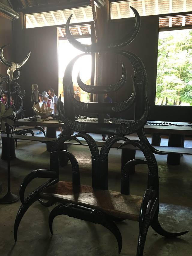 黑庙(Bandaam Museum),又叫Black House或者Black Temple,其实它不是庙,而是一座博物馆。它的创造者是泰国著名艺术家Thawan Duchanee,他的画作在当地相当著名,价值不菲;但他并不就此停步,在清菜自资修建了一个巨型的花园式博物馆,博物馆主题是死亡。他穷毕生精力搜集了大量难以想象的关于死亡的展品,包括数千年前的兽骨,原始民族的猎杀工具,各式各样的古代工具、古董和标本等,用现代装置艺术的手法,把展品融合成一件一件的艺术品。例如用水牛角构成的巨型座椅;古代木船上的魔鬼浮雕;吊在半空的风干动物皮造成的风铃装置等;巨型的庙堂式展厅中央高十多米,从大门及两旁泰式木窗渗入的阳光,只能把这漆黑的大堂一角照亮,余下空虚一片的黑暗,给你留下一片无间的联想。