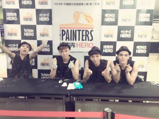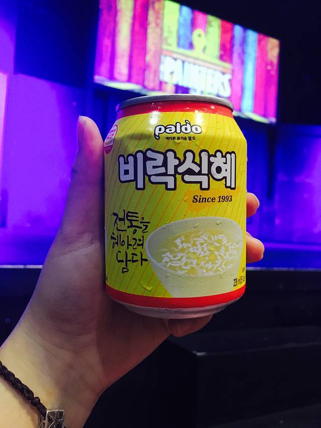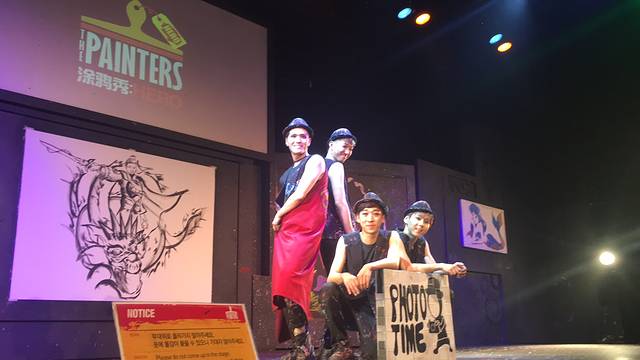 然后!重点来啦!就是在准备去韩国之前已经计划很久准备去看的페인터즈涂鸦秀!!!我觉得这场秀真的是点睛之笔!让我们这次的韩国行更加的完美!如果大家在去之前就在网上订好票的话 可以在开始前一小时去取票 然后就可以进去啦! 在进去之前还不忘买瓶饮料边等边喝 进去之后发现我们这次的座位很好!是在第一排!看的非常清楚! 终于!演出开始啦!( 因为我看的那一场是毕加索队的欧巴们的演出,所以下面我就用直接打欧巴们的名字啦!) 第一个出来的是朴元彬欧巴!半裸着上身在紧张的音乐中刮画,但是我已经不记得刮的是什么了,因为我和我的小伙伴已经沉浸在欧巴的好身材中无法自拔哈哈哈哈哈哈 然后所有欧巴们一起出来 每人一块画板开始画画,刚开始画的时候欧巴们把颜料挤在手上往画板上甩,结果就是第一排的我们的衣服上都留下了与欧巴见过面的痕迹! 因为每人一块板 所以画好我都没看出来欧巴们画的是什么,直到欧巴们把四块板拼在一起我才看出来是迈克尔杰克逊,然后欧巴们还跳了一段迈克尔杰克逊的舞蹈!不得不说真的是四位长得又帅 身材又棒 舞跳的棒 画画也画的好的欧巴们!然后接下来是张韩力欧巴用黑色的颜料在黑色的板子上画来画去 搞的观众们一头雾水!后来在欧巴画好之后把板子抬上去 只听见沙拉拉一声响 然后欧巴把板子放下来 看到金色的沙子掉下来 然后粘在了欧巴画的画上,我们这才看出来原来欧巴画的是李小龙!真的太佩服欧巴们了!