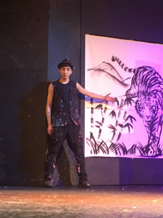 欧巴们给的惊讶并没有到此就结束,紧接着就是权五文欧巴出来了,只见短短的五分钟内 欧巴就画出了一只栩栩如生的老虎!这张欧巴和老虎的合影是在最后结束的时候的photo time照的!你们看 画的真的很不错对吧! 接下来是崔祐硕欧巴和朴元彬欧巴表演了,整个舞台突然变黑 然后只见两个欧巴在用那个在最开始和观众互动用的透明的小刷子开始在舞台上画画,陪着浪漫的音乐,欧巴们画出了一只丘比特和一对恋人,我觉得这是正常我最喜欢的part了! 最后是欧巴们一起合作 在一个玻璃槽里面画了一个海洋世界!有各种鱼 还有珊瑚 海马!真的是美丽极了!画完之后欧巴们把板子放进玻璃槽里面去出来 发现把玻璃槽里的世界都移到了画板上!然后欧巴们把边角一撕 我们发现海洋世界摇身一变就成了美人鱼!真的是又美丽又神奇!