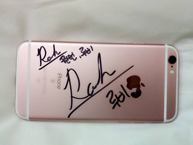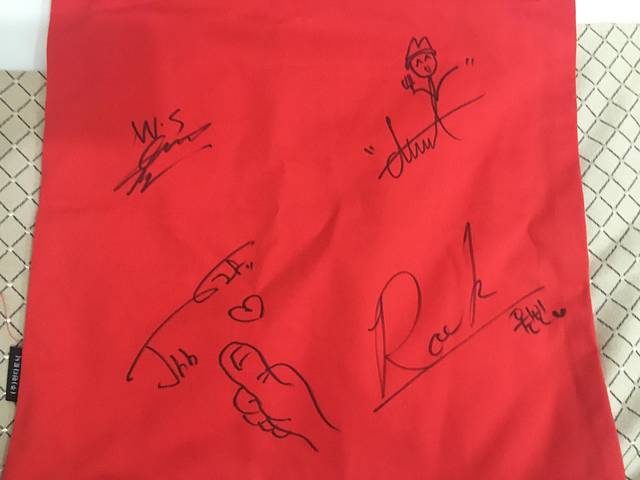 没办法 我们只好恋恋不舍地出去了,但是出去后发现还有欧巴们的签名会!于是我赶快去买了欧巴们的T恤和帆布包去找欧巴们签名!还给我的手机上也签了一个名!签名的时候还给欧巴们又说了一遍辛苦了 今天很享受!!!