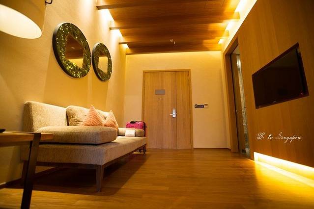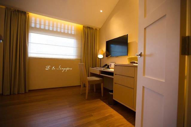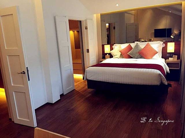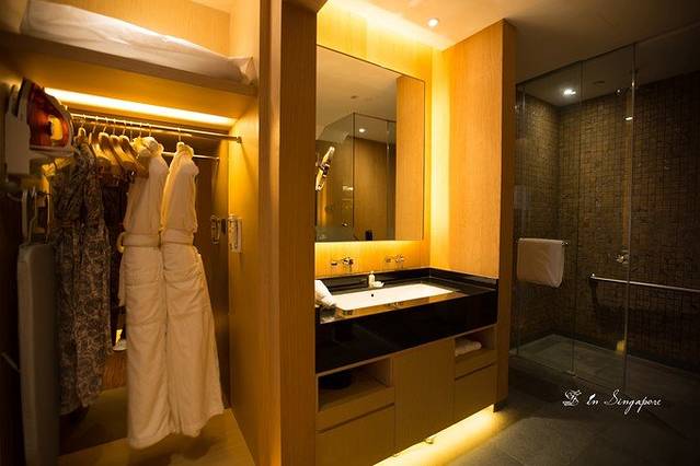 排队等德士大约15分钟左右,司机是个华人,给他看了酒店预订单,他开始说不认识,但一说是圣淘沙鱼尾狮像对面他就知道啦,从机场开往酒店的道路两旁种植了长排的花草,加上干净的地面和清新气息,心情变得格外开朗,这一路畅通无比,才20分钟左右就到酒店了,打车费20新币的样子,在进入圣淘沙岛时,要出示给相关人员酒店预订单,这样就可以免费入岛,否则可是要收入岛费的。酒店办理checkin的是个韩国MM,会说中文,态度很好,更好的是免费升级房间。哈哈哈哈,还有专人帮我们提行李到房间,服务值得表扬哦。在这个寸金寸土的小国,每晚1000出头的价格入住这样40多平米的套房信价比已经算不错了。唯一的缺点就是没有阳台。