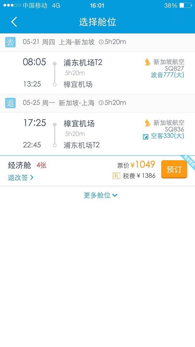 订完后的一两周发现价格上涨了一点。我还庆幸自己下手快。但是,但是,但是等到出发前两周我就后悔了,明明已经订好了,还手贱回过头去看价格的人注定要悲剧啊,发现携程上新航上海直飞新加坡的往返机票居然只要2400多,还是早去晚归的航班。