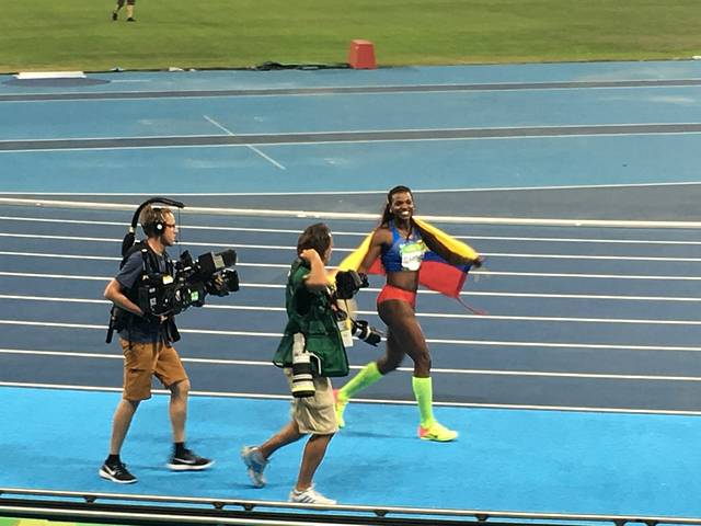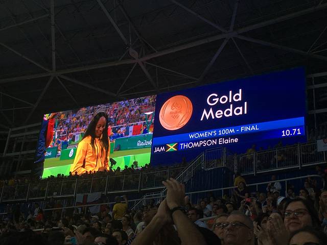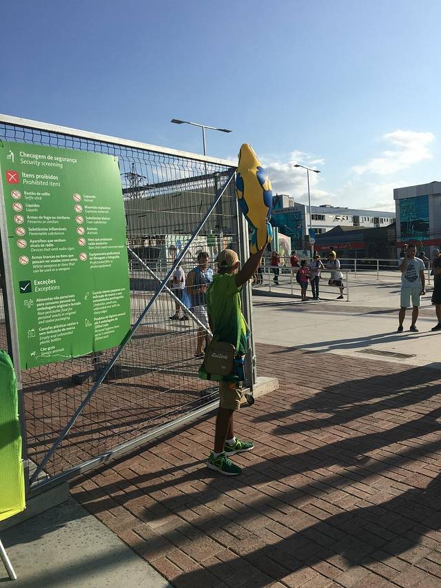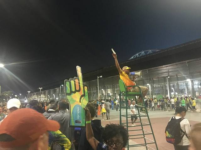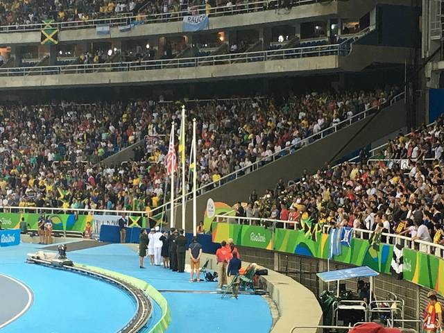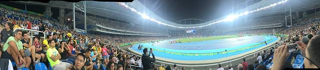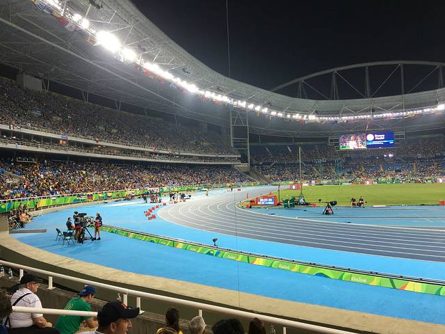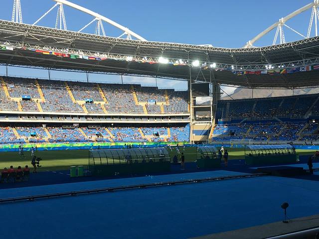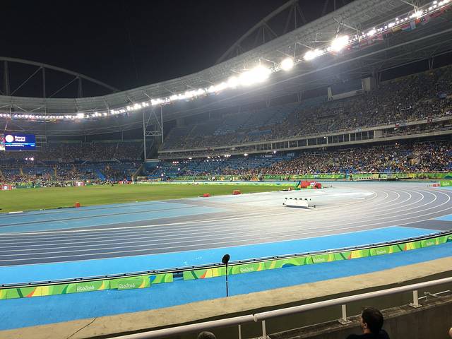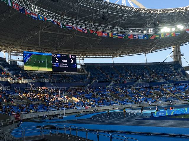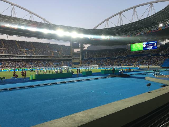 由于大名鼎鼎的马拉卡纳(Maracanã)体育场建造时并没有设计跑道,田径比赛的场地选在了里约足球豪门博塔弗戈队(Botafogo)的主场——阿维兰热体育场,这里在奥运期间被称为奥林匹克体育场(Engenhão)。在奥运开幕的前一天,我还去这里观看了男足小组赛的两场比赛,一来算是摸清门路,为奥运预热;二来也是体验一下足球王国人民的热情。