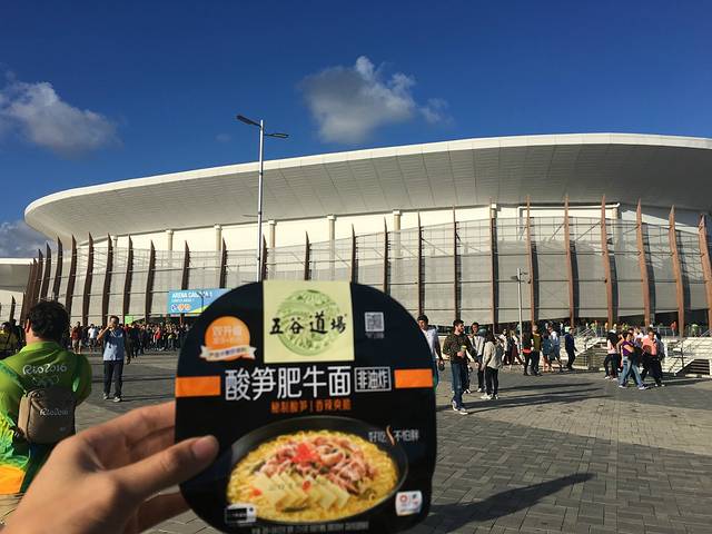 由于田径决赛实在太过火爆,去往体育场的路线很早就开始堵车了。为了不耽误看比赛,我们连晚饭都没敢吃就匆匆忙忙出发了。情急之中带上一盒面,希望在观赛中保持体力不要饿晕……虽然之前看足球小组赛来这里踩过点,但是田径的火爆程度还是超出了我的想象。看到这么多一起进场的吃瓜群众还是会担心进去会迟到。还好志愿者同志非常给力,及时给我们推荐了队伍最短的通道,顺利入场。