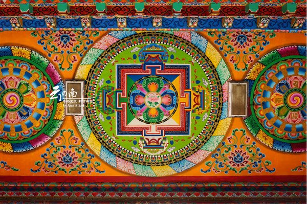 进门的天花板,花纹和用色都很浓重,典型的藏族风格,看起来就像是一块巨大的唐卡。