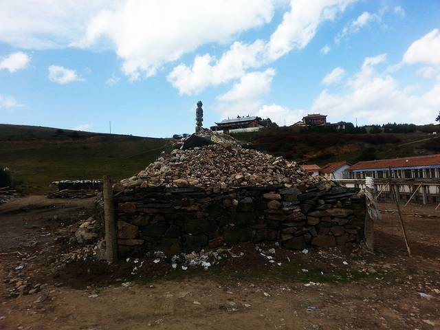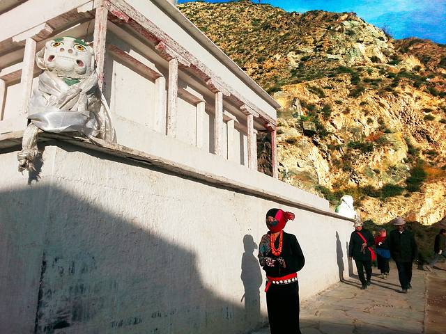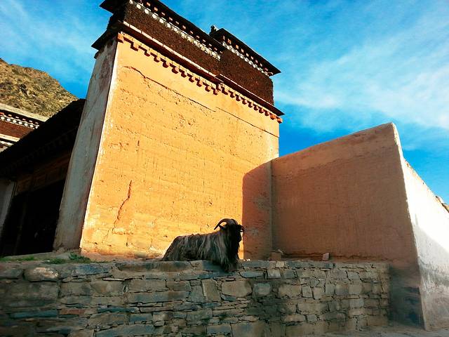在寺院的北部,本应在右手延续的嘛尼轮被一段土墙代替。你可以看见藏民们在酥油抹黄的地方磕头。实际上很多酥油抹黄已经变成了黑块,但这并不影响你随磕随喜,在大金瓦寺的后墙接受弥勒佛的祝福和保佑!