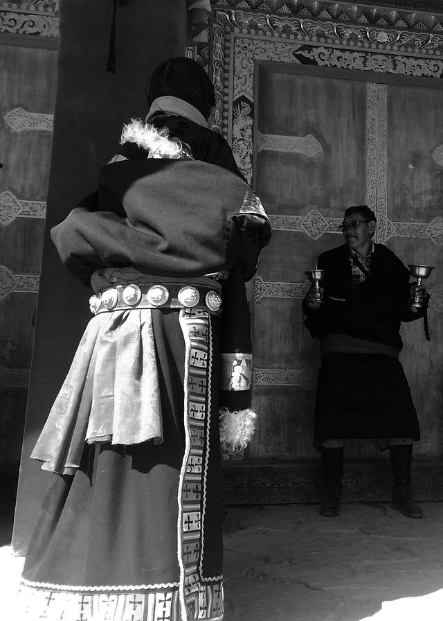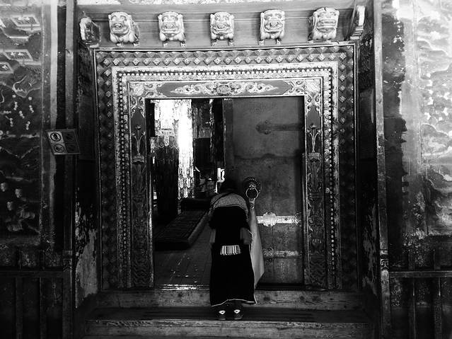 转经伊始,路过一个无名寺殿(其实我并不清楚它的名字),殿内有僧人在做法事,窗户上有一层薄薄得轻纱,在窗外窥伺了一下,只看到明晃晃的烛光。