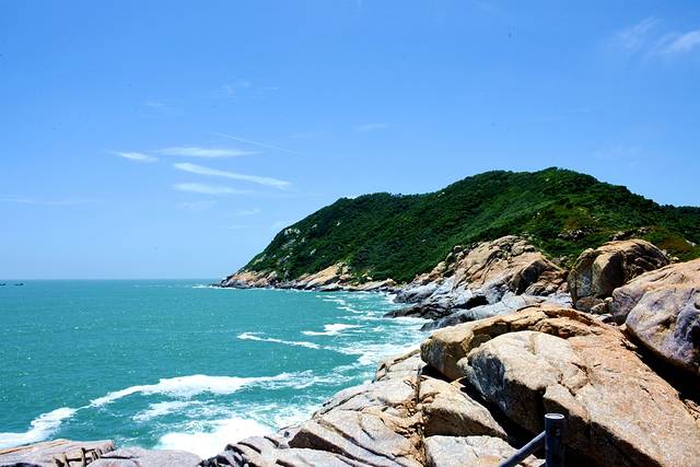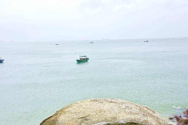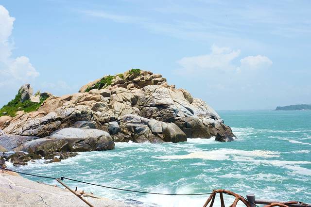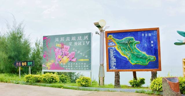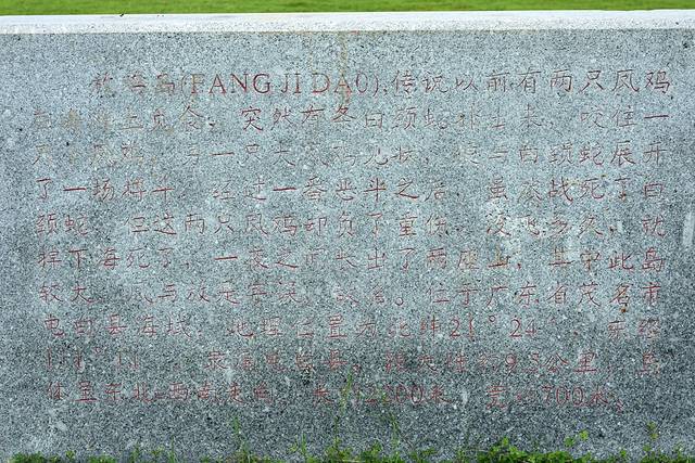 已经褪色的放鸡岛石碑,简单介绍了放鸡岛的来历:放鸡岛(FAGN JI DAO),传说以前有两只凤鸡,在海滩上觅食,突然有条白颈蛇扑出来,咬住一只凤鸡,另一只大凤鸡见状,便于白颈蛇展开了一场搏斗,经过一番恶斗之后,虽然战死了白颈蛇,但这两只凤鸡却负了重伤,没飞多久,就掉下海死了,一夜之间长出了两座山,其中此岛较大,凤与放字误,故名位于广东省茂名市电白县海域,地理位置为北纬21度24“,东经111度11”,隶属电白县,距大陆约9.5公里,岛体呈东北-西南走向,长约2200米,宽约700米。