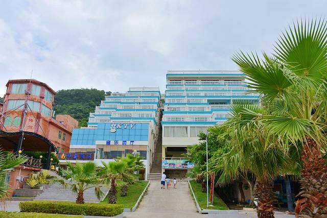 上了岛,在码头就有酒店的前台,我们时打算住一晚,码头这里问觉得贵,就先转转,对比一下,看看有没有便宜的,结果发现放鸡岛就是一个纯粹的度假小岛,岛上没有原住居民,所以也就没有民宿了,只有酒店,主要有凤凰木屋、瑞鑫酒店、星月楼、碧海楼还有一个博贺港大酒店,酒店房价都是比较高的,而硬件条件算一般,但景观有一流的海景,这些酒店的定价都是统一的周一到周四6折,周五7折,周六日8折,讲不了价的,网上预订比现场入住要便宜很多,所以直接网上预定就好。年轻的同学也可以试试住帐篷,自带的收50场地费,租的是150元,别有一番趣味。