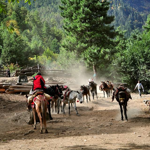 回梅里第一家,整理好行李,再登上天台,望一眼如此之近的雪山。约9点,我们开始骑骡出山。