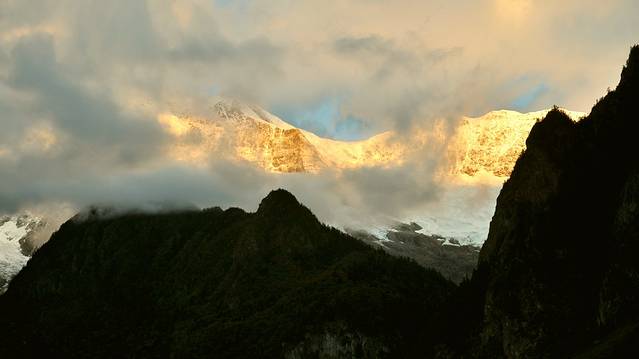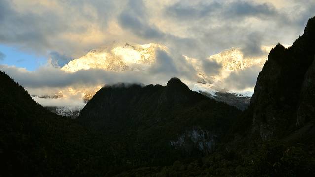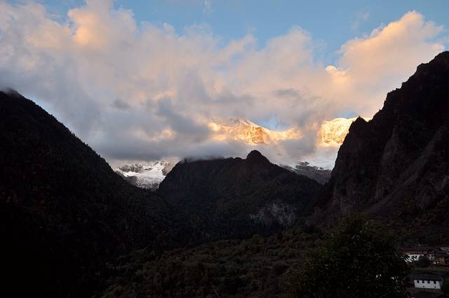 今日,早起,期待日照金山。虽说秋天很难看到梅里雪山的全貌,虽说昨日云层如此如此厚实,但,仍要早起去祈祷日照金山啊!然后继续向着雪山进发,一路颠簸,赶往西当村,然后或全程行走,或骡子代步,走向雨崩村—雪山底下的小小村庄!