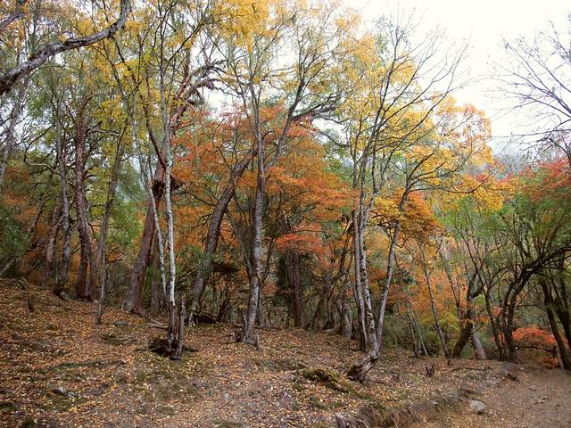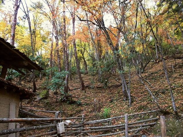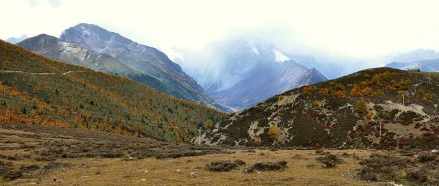 山路迂回,我们渐渐往上兼向前进,接近白马雪山,看到色彩斑斓的秋天。