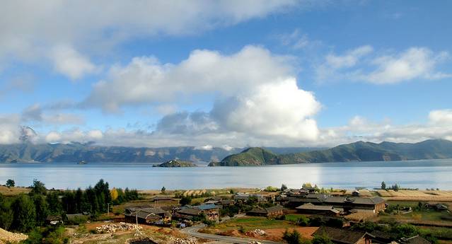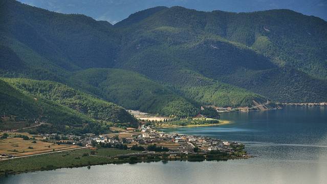 远距离眺望里格半岛,突入泸沽湖的小小半岛,我们未来两天的落脚点。