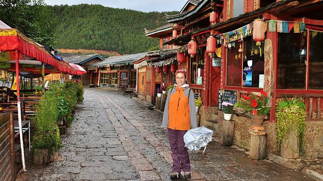 雨后,湿漉漉的石板路,静悄悄的清晨,路过昨晚的晚餐地,扎西家,留个影^_^