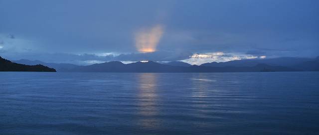 我们缓缓至湖心小岛,渐渐周围有点亮光,看到天际厚厚叠叠的云层,及其间奋力穿透的那丝红光。