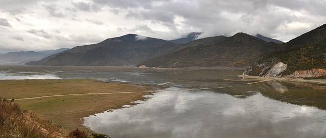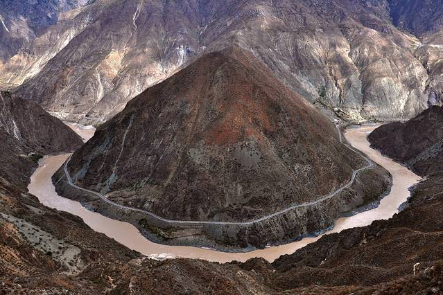 午餐结束,继续上路,海拔开始上升,到了月亮湾,即金沙江大拐弯,滔滔的江水在大山间奔腾而行。可惜,这个季节的大山是光光的,江水是黄黄的,不是她最美的时候。远看,中间的大山想不想咖啡味的雪山包^_^
