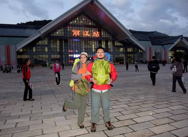 七点多的丽江,我和大宝,各自背着大包小包合影^_^