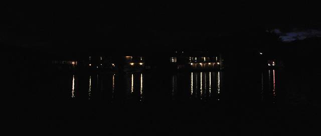 6:00起床,一片黑色,只有守夜的灯光和它的倒影。与许健、王兵碰头后,坐上小舟,静悄悄的,摸黑潜行。