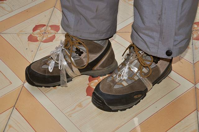 这是我的鞋子,更惨,鞋跟处的鞋底开裂了,于是,赶紧找了绳子绑上,拜托拜托,让我熬到广州吧!
