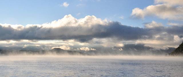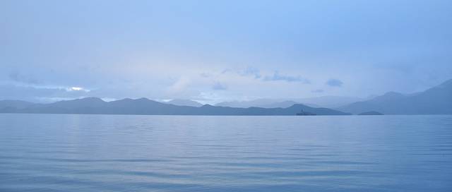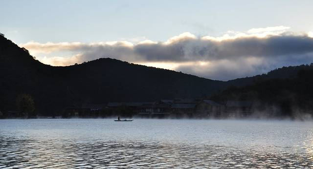 其实,七点刚过,天还未亮,云朵还灰灰的,大山还黑黑的,湖水还暗暗的,但是,今早却有超级飘渺迷幻的雾气,整个湖面升腾着,似人间与天际间的交流。