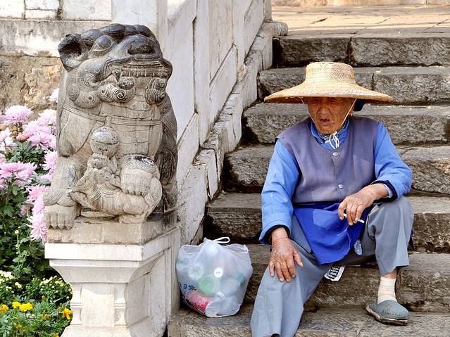 在园内石阶休息的拾瓶老太,有着如油画般的皮肤,深刻动人。大宝偷拍的^_^