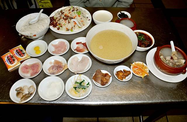 干巴炒饭,汽锅鸡,其余的是风味过桥米线套餐(九小份生食+米线依次放入汤底中,还有四小份熟食,一小煲汽锅鸡,一碗红油血旺),吃饱饱,很美味,且一共48元而已^_^。