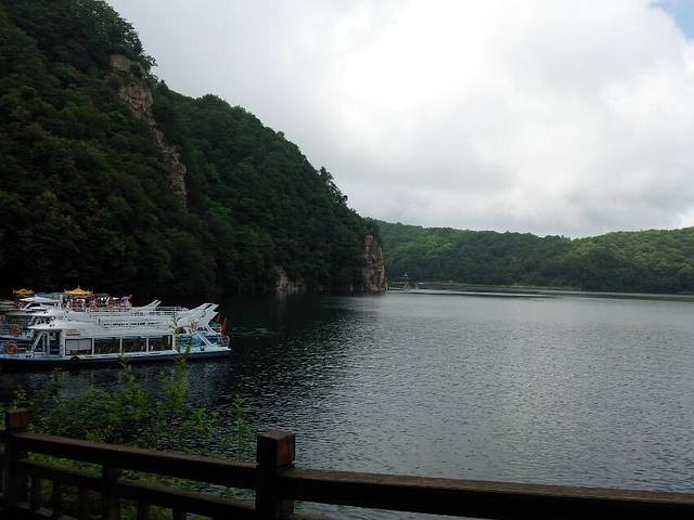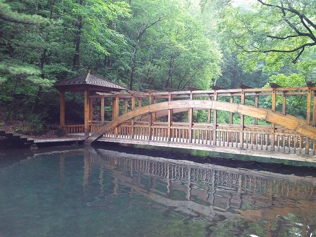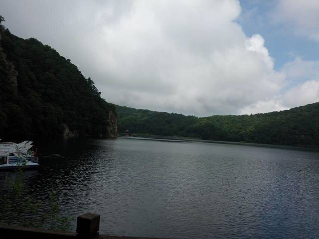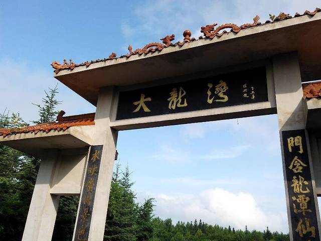 仿古建筑的山门。之所以叫三角龙湾是因为传说有一只三只角的黑龙在这里行云布雨,普济一方百姓。后来龙去留湾,所以叫三角龙湾。龙飞到了哪里呢,据说飞到了长白山天池。难道黑龙就是天池怪兽?哈哈!都是传说,大家听听就可以啦。